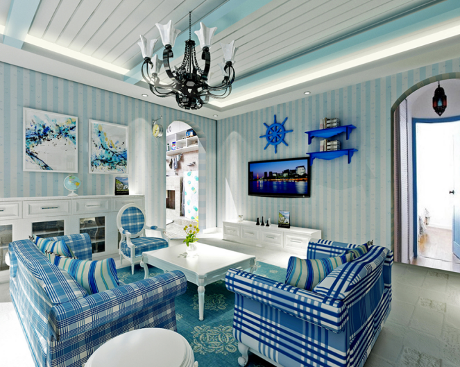 提到地中海风格的居室,立马就想到了蔚蓝的天空,所以地中海风格装修也主要以蓝色调为主,既然无法置身于微风徐徐的海边,那么拥有这样一间地中海风格的客厅也不错。