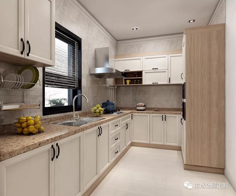 在厨房中定制的橱柜用花岗岩台面,与柜体的颜色刚好搭配得相得益彰,而黑色的把手在浅灰面板上显得清晰明快,让橱柜的色彩既有融合也有对立。而这种暖系厨房,也让做出的饭有着温暖的味道。