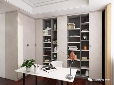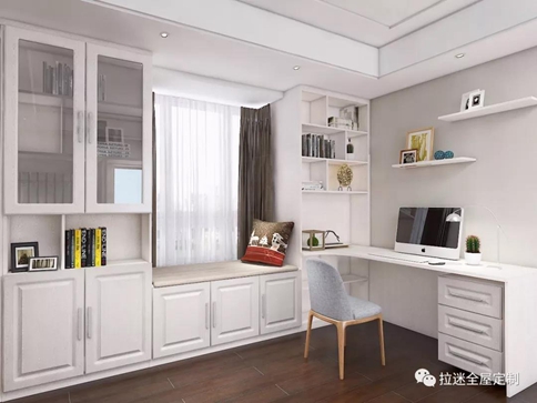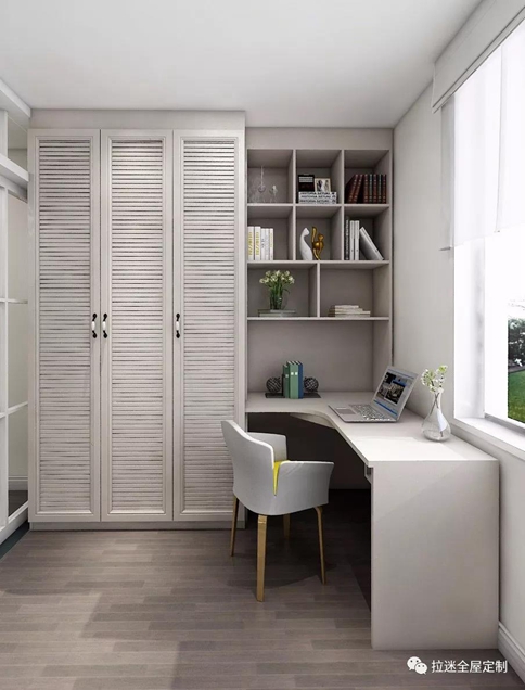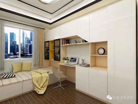 对于小户型而言,在有限的面积内实现自己想要的一些功能是需要花更多心思的。比如写字台的设计,可以集书桌、书柜、衣柜、展示柜等等功能于一体,相当于节省了不少空间。