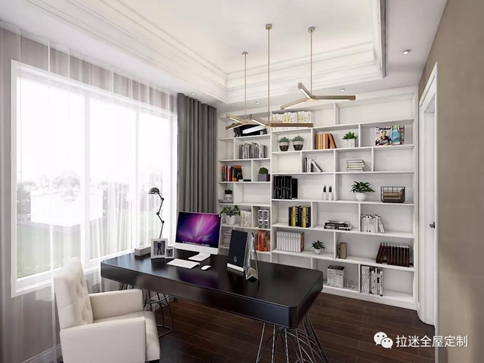 转角L型的书桌,线条弯曲柔和,打破书房的沉闷感,可利用空间大,性格开朗活泼者最爱。
