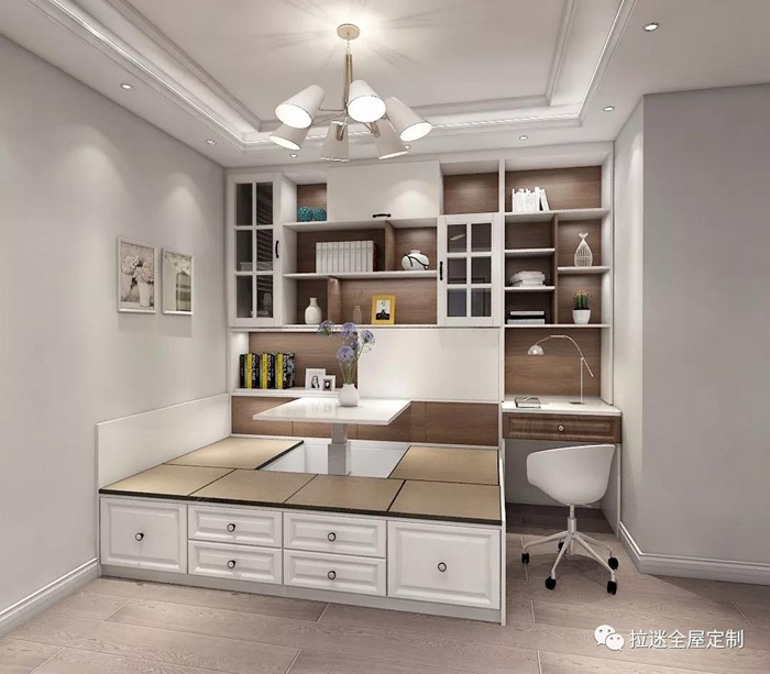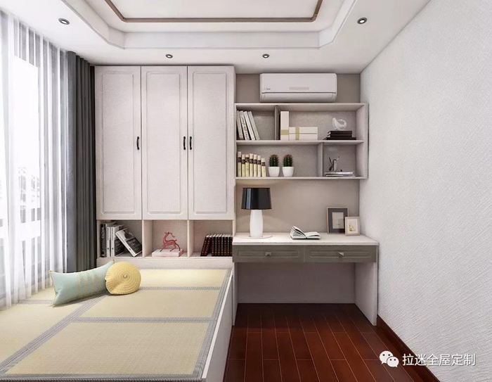 一个超级实用的榻榻米空间,可以结合靠墙而立的定制柜体,来提高整个房间的收纳机能,达到“一房多用”的目的。