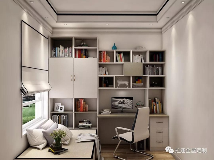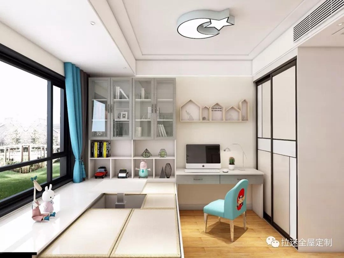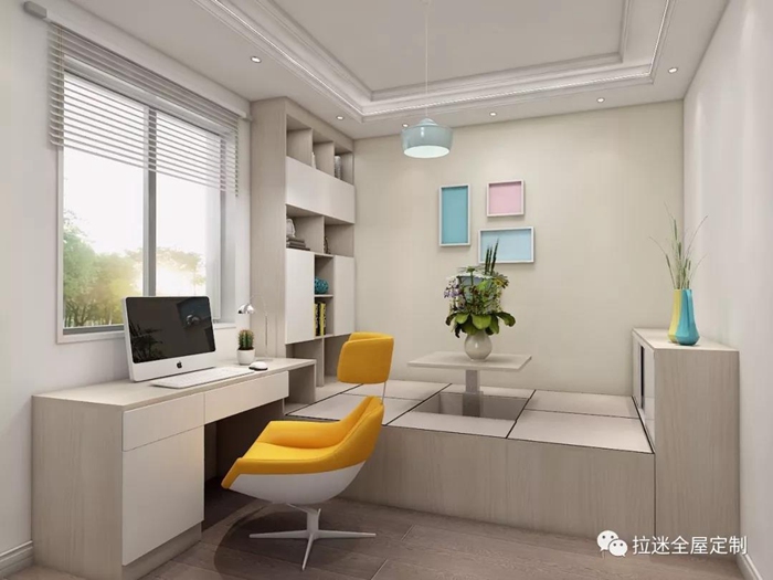 如果因户型面积受限,无法拥有一间独立书房的话,可以把榻榻米空间打造成一个小型书房,更能展现一分恬静的感觉。