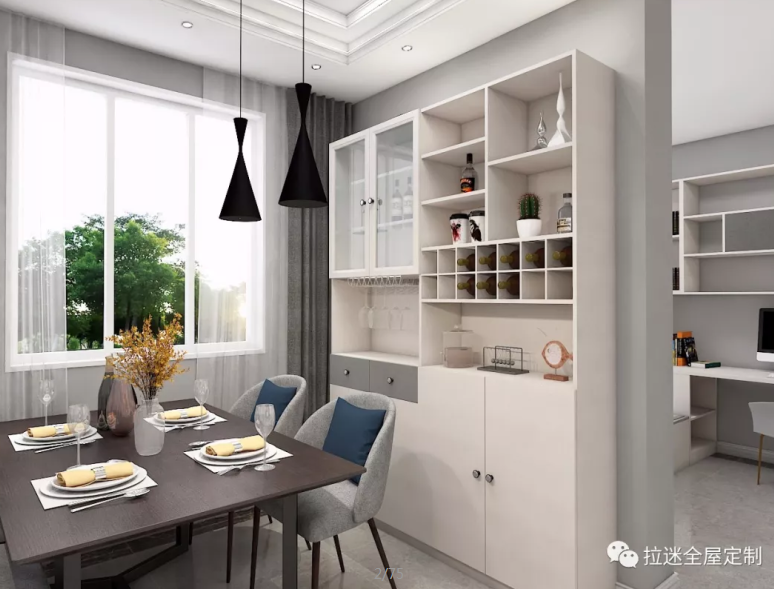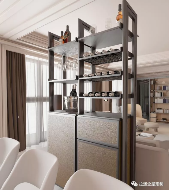 将餐厅与客厅空间用酒柜来隔断,隔断柜与餐边柜合二为一,自然不造作;不仅具有功能性,还兼备美观性。