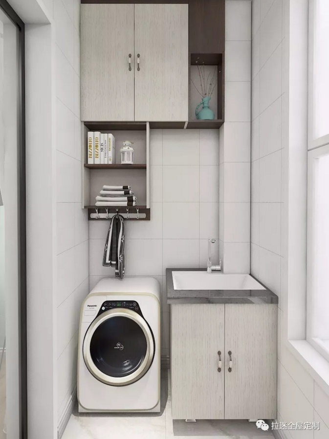 除了安放洗衣机和洗手盘,把阳台变成一个洗衣房和洗漱区之外,阳台的另一个作用就是安装收纳柜。