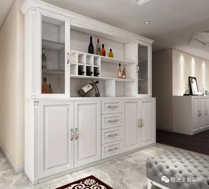 在一些高端的住宅,常见餐厅和客厅之间设有较大的餐边柜,上层是存放红酒、酒杯等设计的样式,下层则是具备储藏功能的双开柜设计。