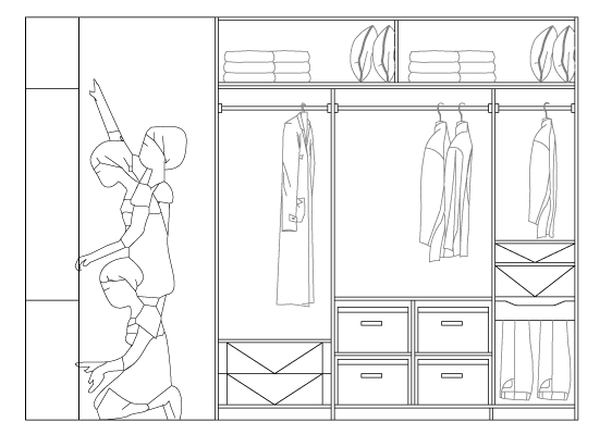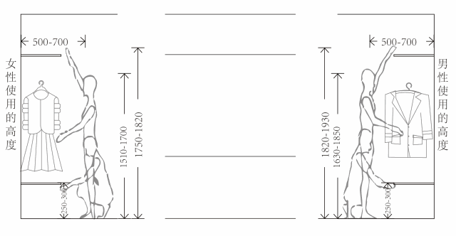 由上图可以分析出我们设计衣柜时必须考虑的三点,第一点使用的频率、第二点收纳物品的重量、第三点人体工程学,结合这三点的我们可以将衣柜分为三个不同的区域。