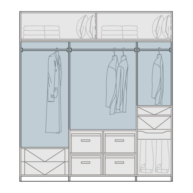 中层区:中层区是存取物品最为方便的高度,这一层可放置挂一杆,根据衣服的长度再继续长短分区。