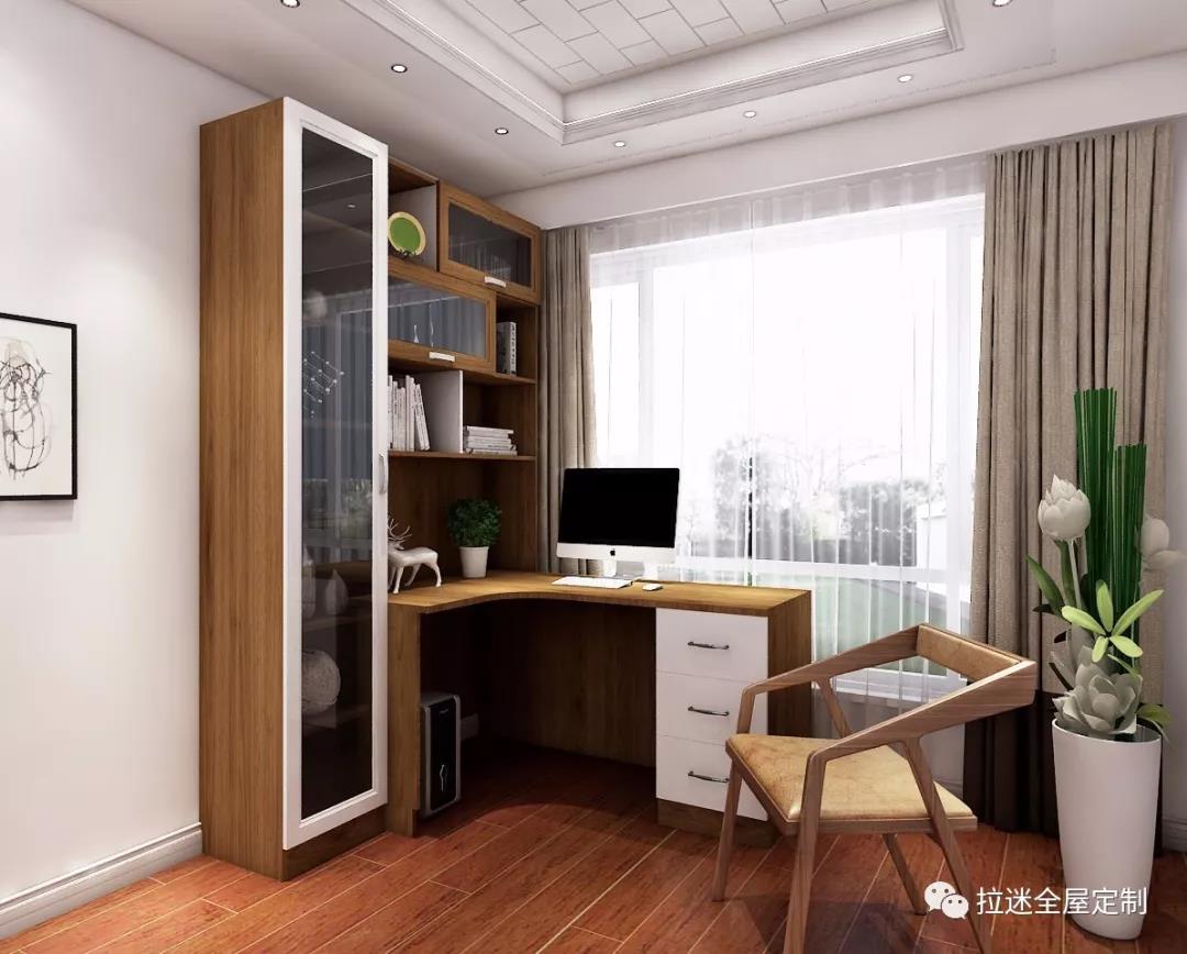 一般的定制书桌柜,多以转角式构成“L”型,充分利用转角位空间,为书柜增添办公区。