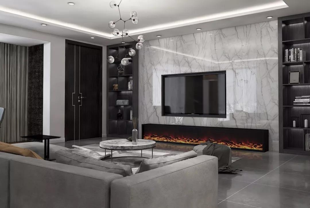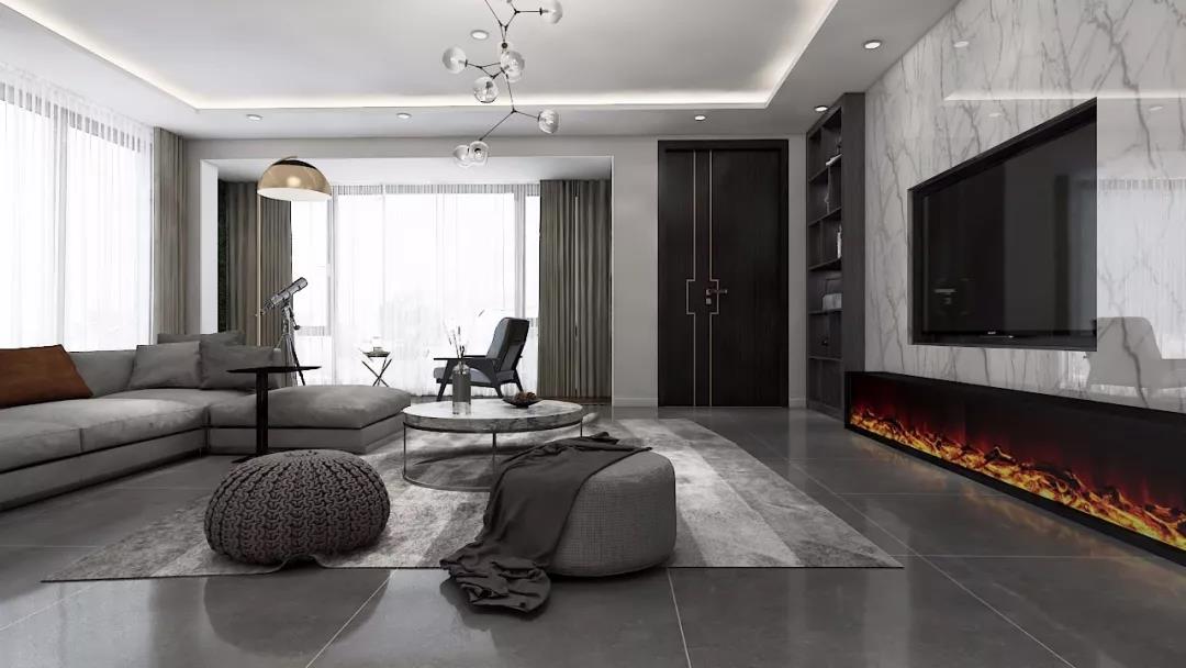 宽敞的客厅没有过多的修饰,让一切看起来都是那么的刚好,白色大理石背景墙与极具时代性壁炉结合,黑色的柜体,营造出极简平衡而又独特的美感。大面的落地窗拥有极佳的视野,黑白灰色调的运用赋予了空间独特的雅韵和品质感。