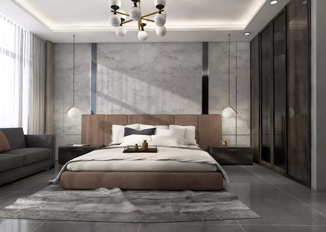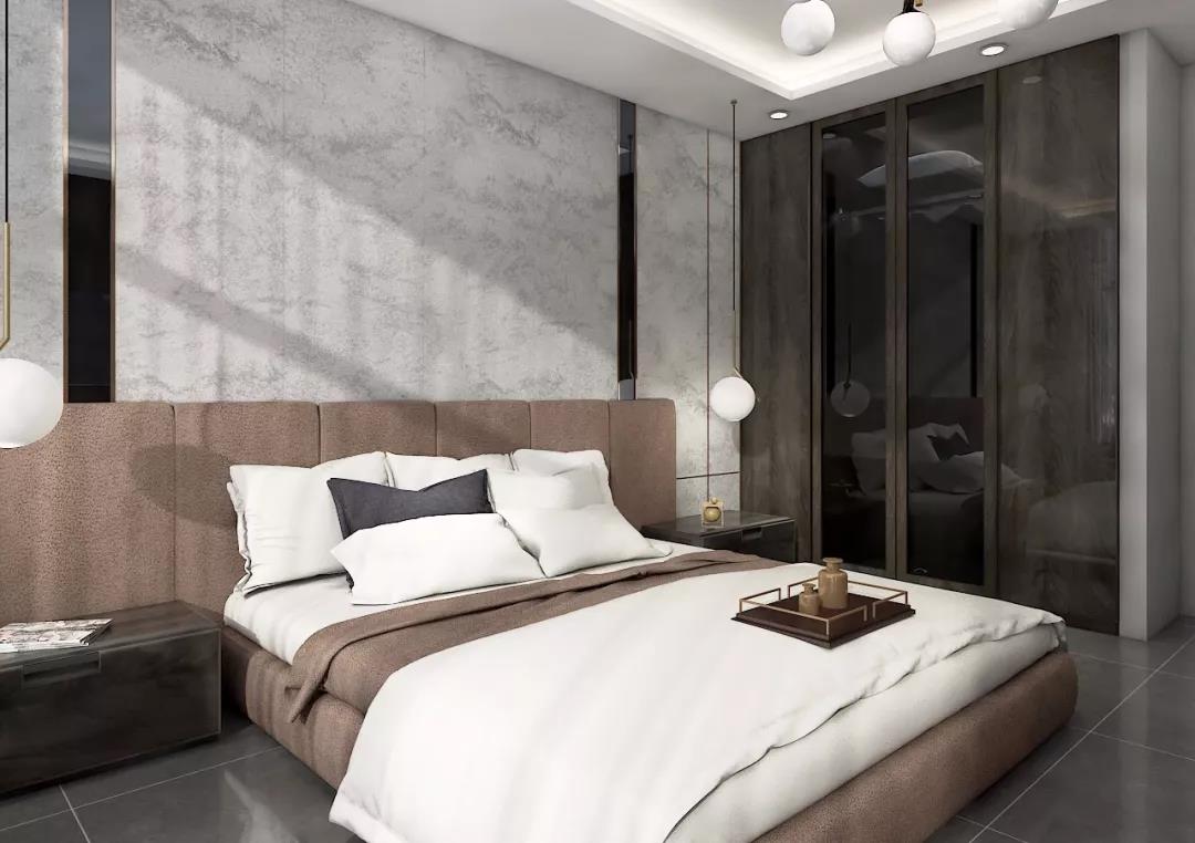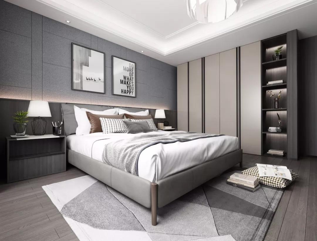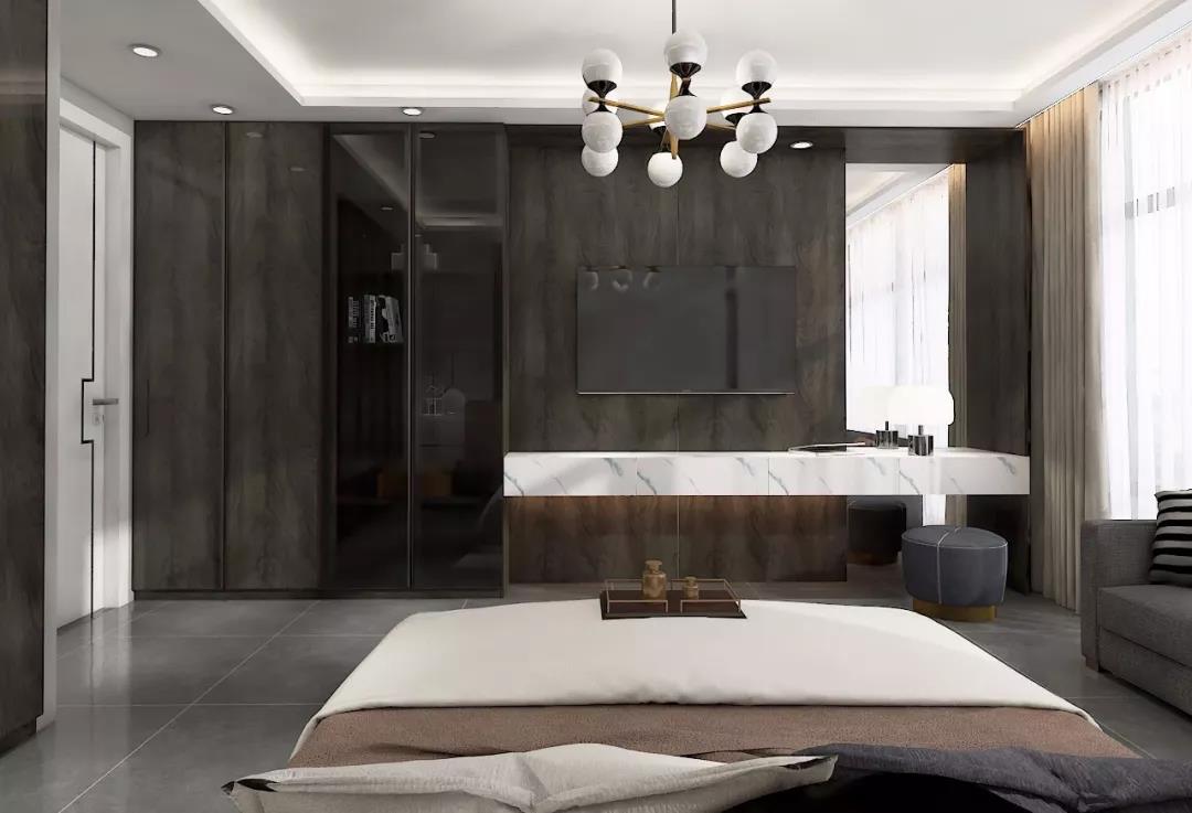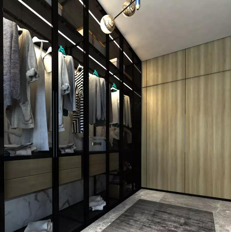 黑色轻奢拉手的运用,卧室的每一处细节都体现出其高雅的品位和不凡的艺术修养,衣柜功能上功能区与展示区的设计,方便使用者的生活起居。柜体同色护墙板的运用更是让整个空间协调整体。