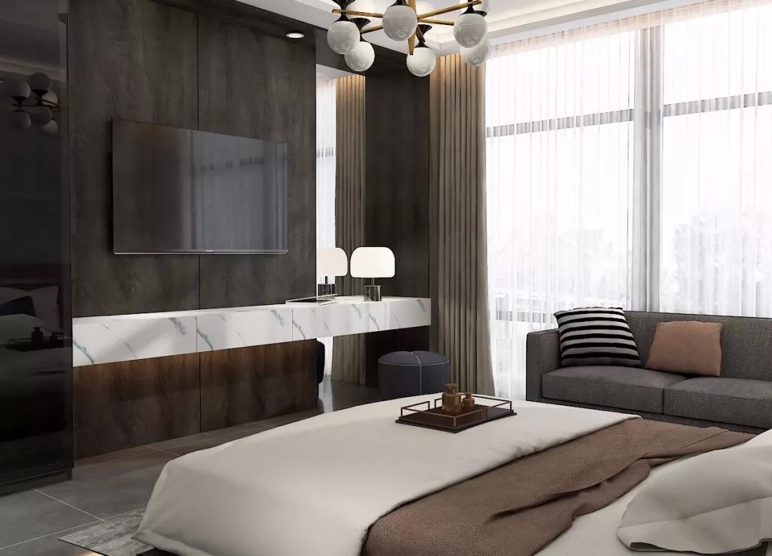 电视柜+梳妆台的设计,加上大理石元素的运用,台面下及窗帘盒内灯光的运用,自然光与人造光叠加,使整个空间更加灵动。