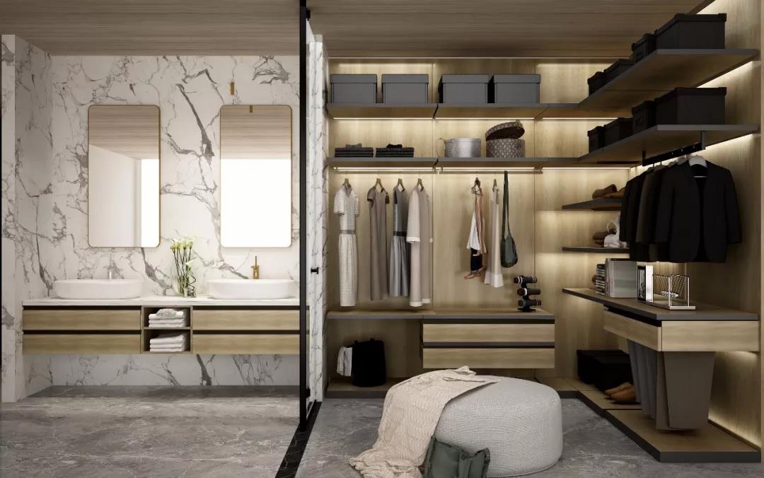 干湿分明是此衣帽最大的优势,卫浴室+更衣室的设计避免了很多不必要的麻烦。全开放式衣帽间,沐浴后可快速找到需要的衣服,一览无余,相比传统封闭式衣帽间,空间利用上更加充分,功能分区上更加合理。