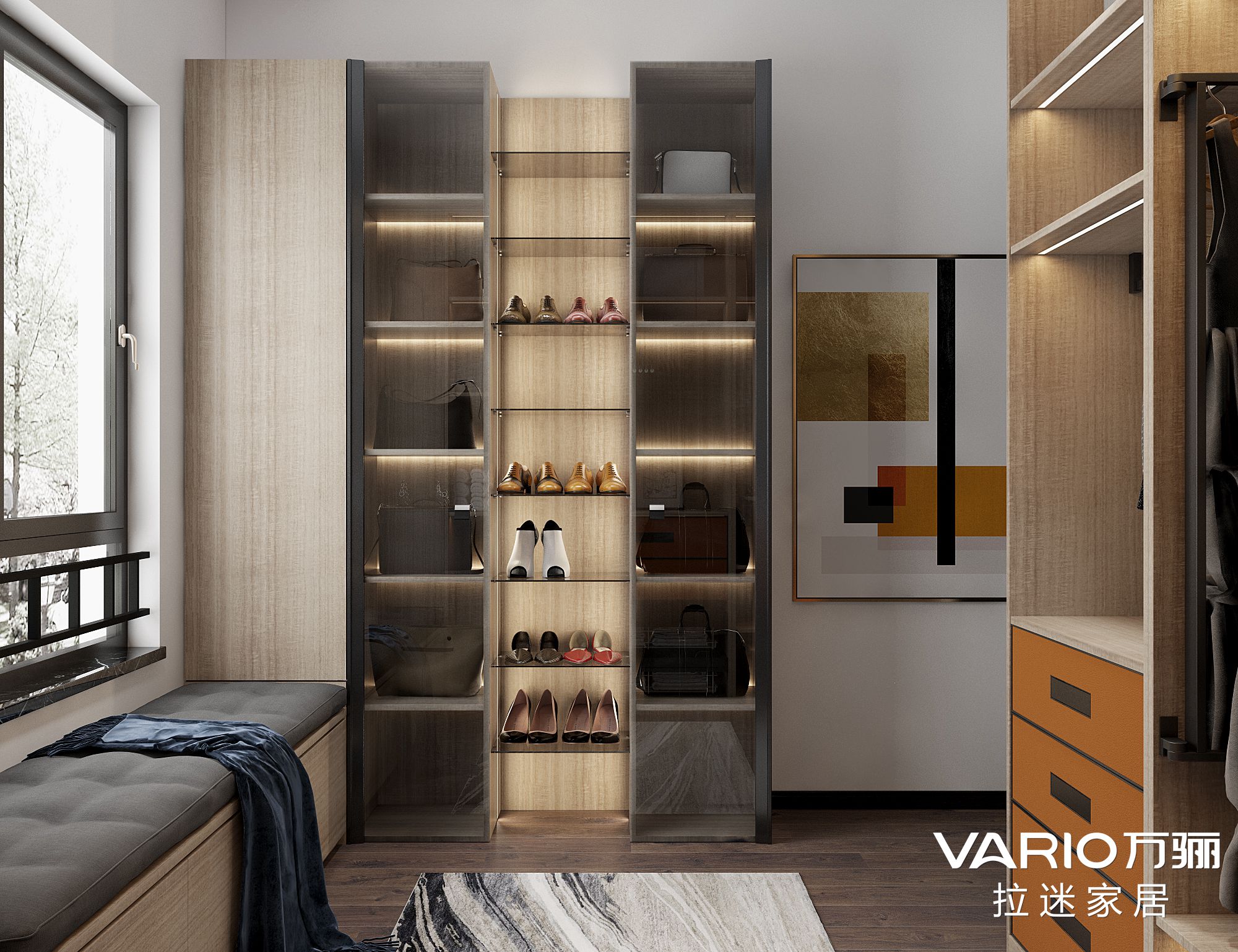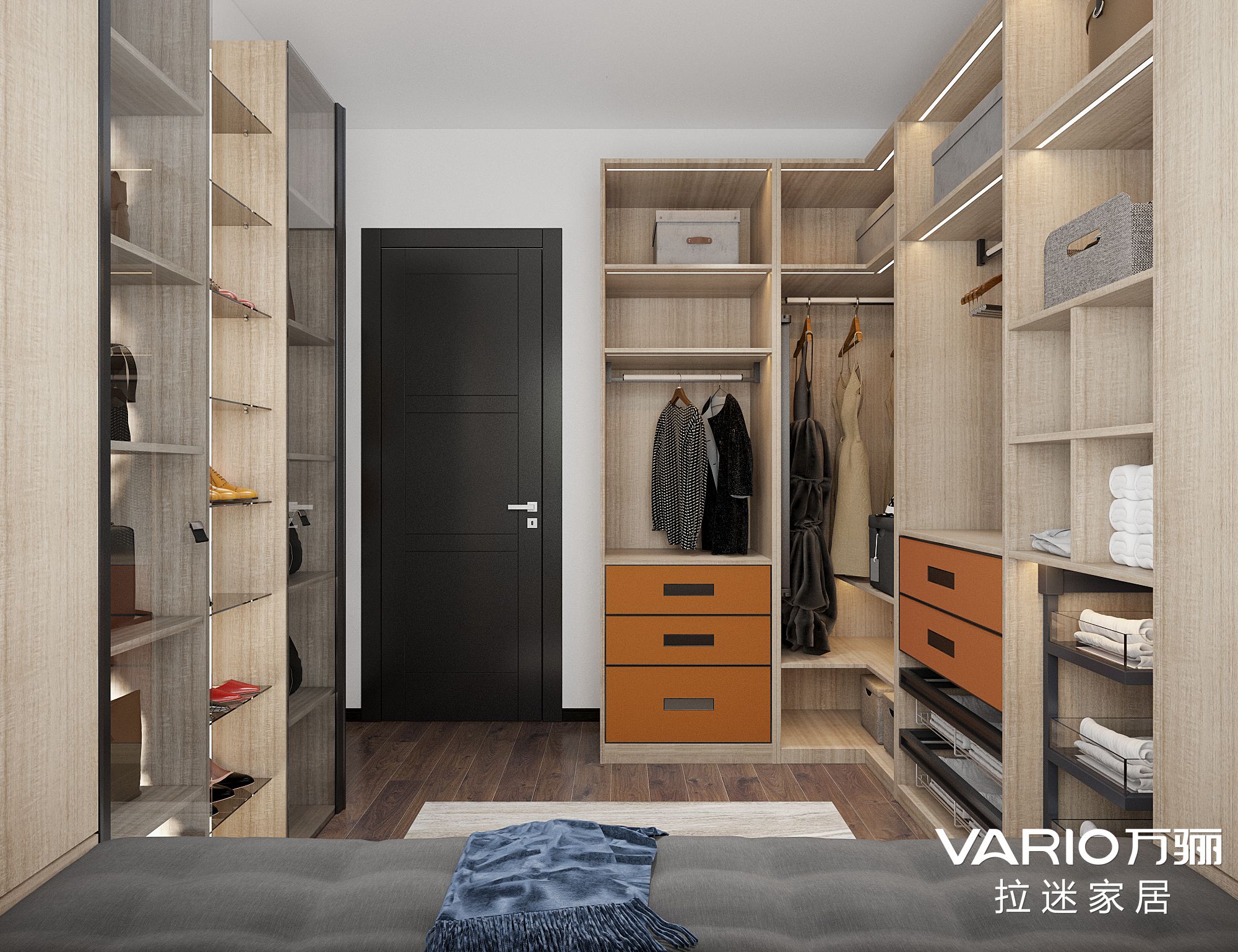 主卧过道打造了两面墙的通顶衣柜,戈登木棉加上黑色描边,