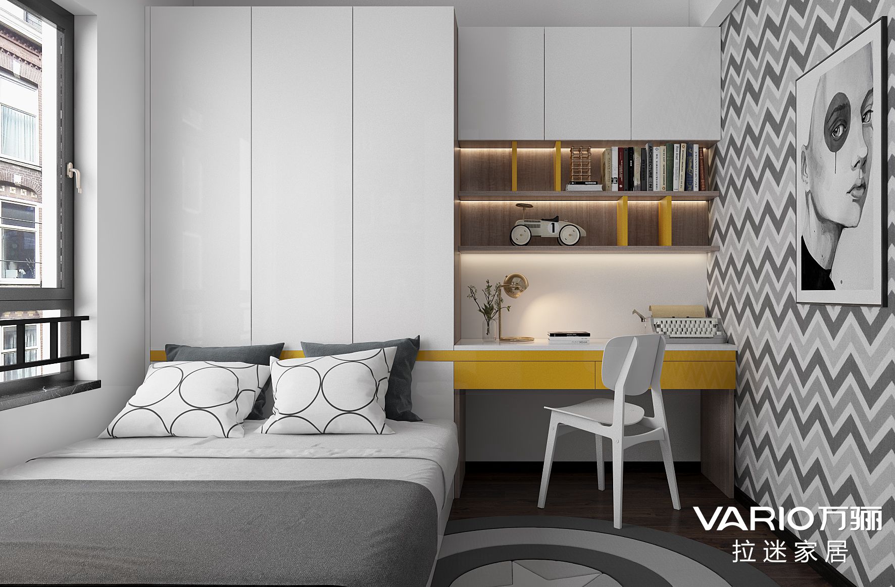 次卧延续了整体的装修风格,极简造型平开门设计,