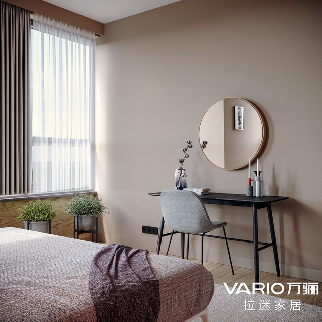 床尾不似一般装修的电视柜,而是搭配了轻便的桌椅和圆镜,一个简单又不失温馨的梳妆台就形成了